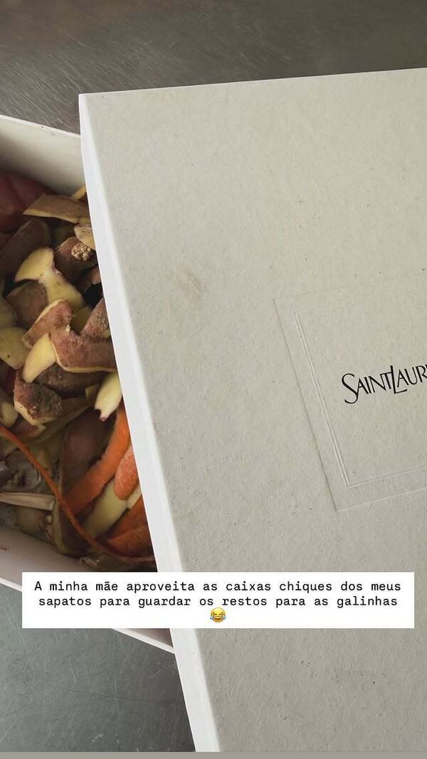 Numa outra publicação nas stories da sua de Instagram, a estrela da TVI revelou uma divertida curiosidade sobre a sua progenitora, Maria Filomena. “A minha mãe aproveita as caixas chiques dos meus sapatos para guardar os restos para as galinhas", revelou a apresentadora de ‘Dois às 10’ e ‘Casa dos Segredos’, com um emoji a chorar a rir.