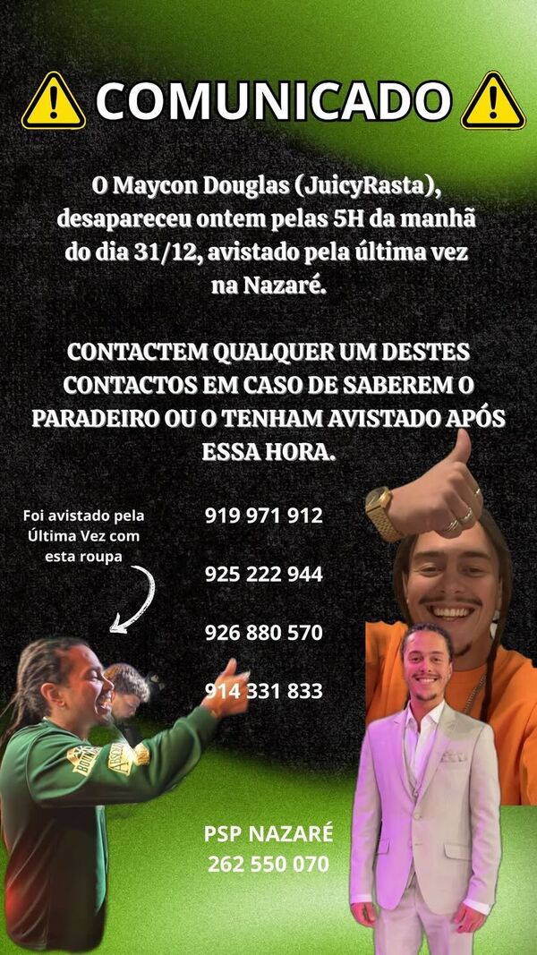 “O Maycon Douglas desapareceu pelas 05:00 horas do dia 31 de dezembro. Foi avistado pela última vez na Nazaré", pode ler-se, dando ainda conta da roupa que o jovem estava a usar, uma camisola verde.
