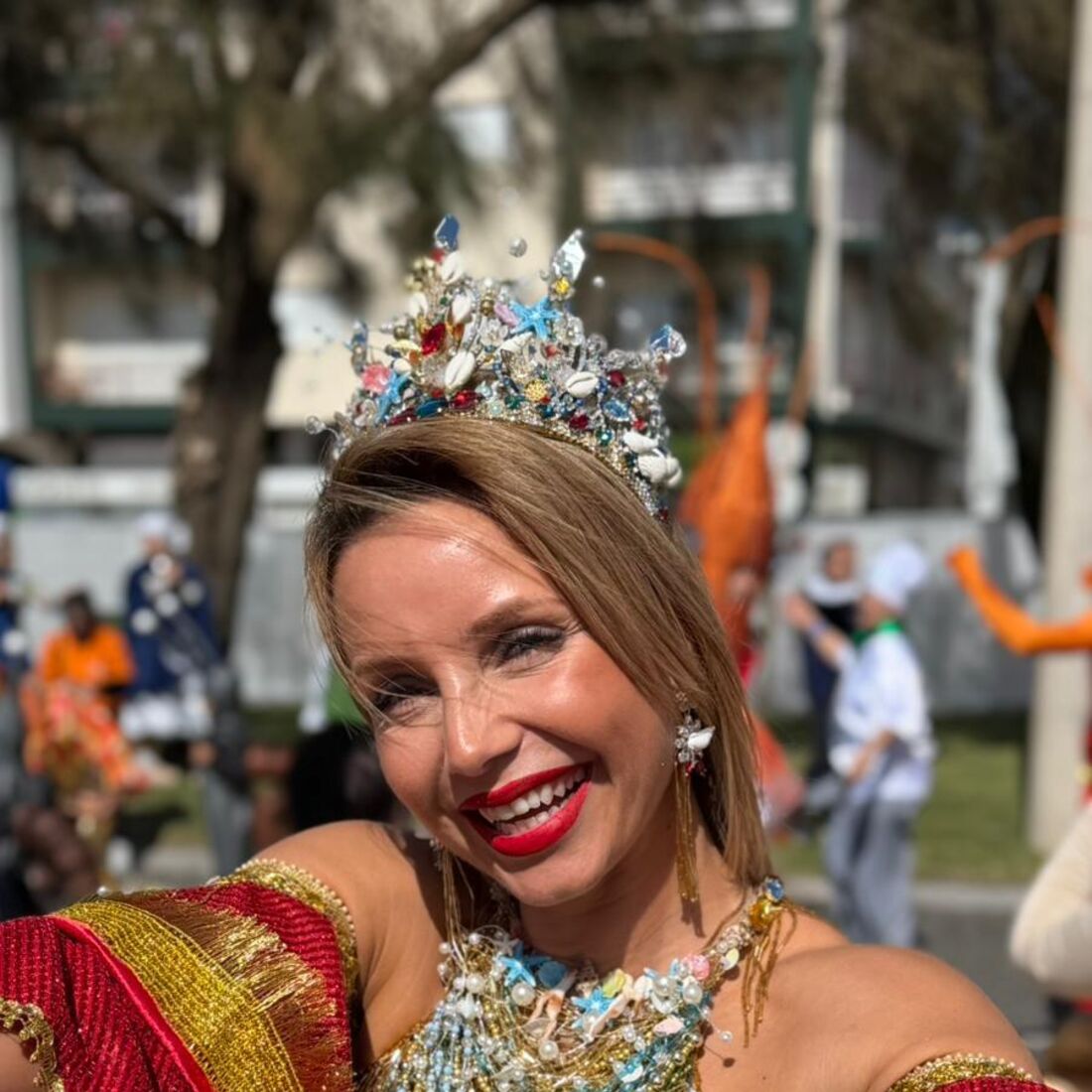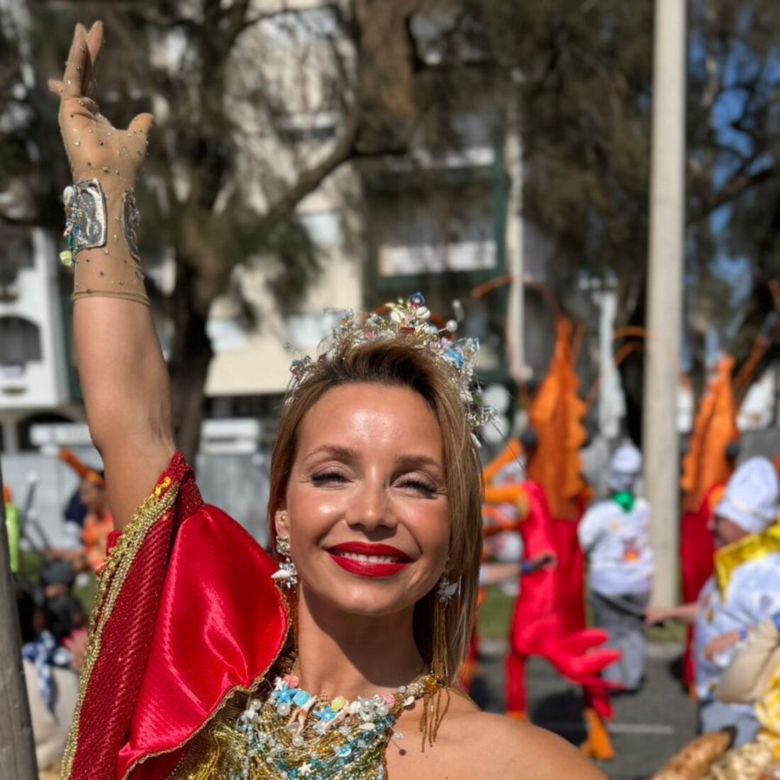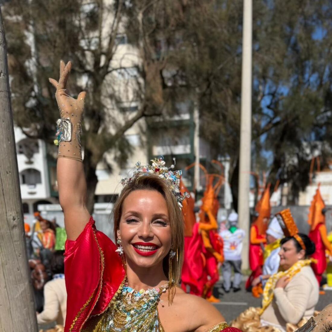 Vestida como uma verdadeira rainha, a apresentadora encantou todos aqueles com quem se cruzou tanto na noite de sábado, 11 de abril, como na tarde de domingo, 12 de abril. Para além de ter contactado com todos aqueles que a abordaram, ainda deu um passo de dança e sambou em plena avenida.