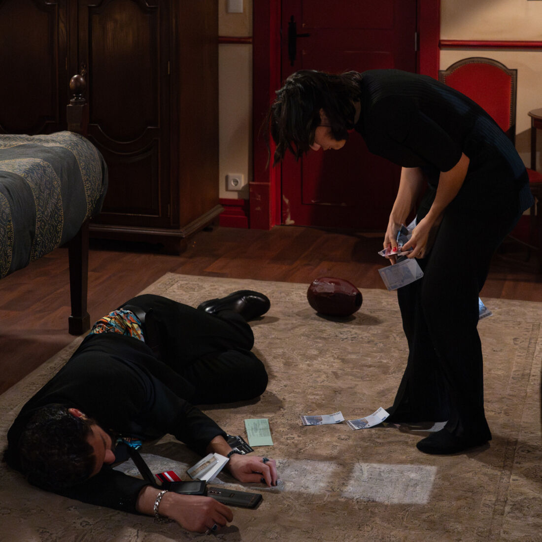 Ao ver o corpo inanimado, a jovem não sabe o que fazer e acaba por simular uma cena de assalto no quarto do malvado, saindo com cuidado para não ser apanhada.