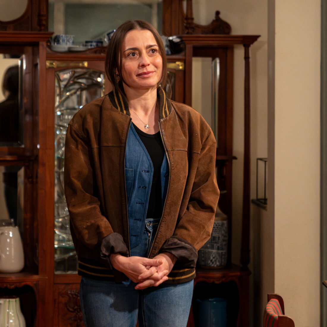 Horas depois, a mecânica e a afilhada já estão instaladas na casa da herdade, mas Sofia explica a Teresinha que está apreensiva com a boa vontade de Brígida, garantindo que tem de falar com o advogado.