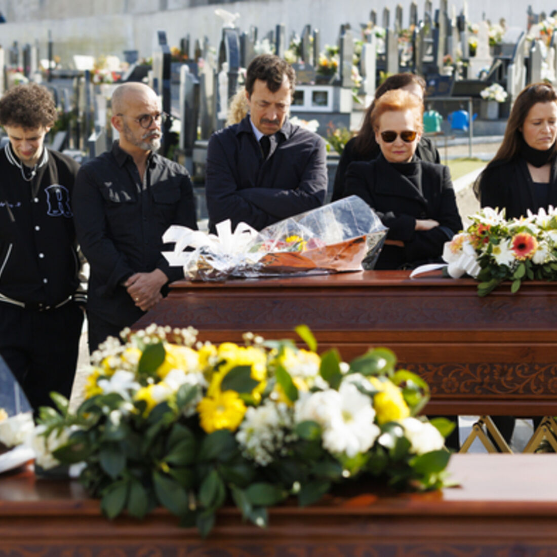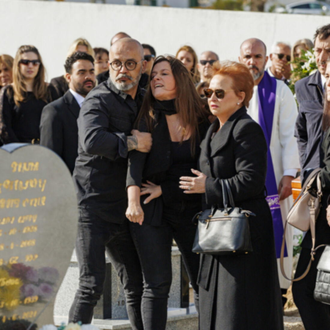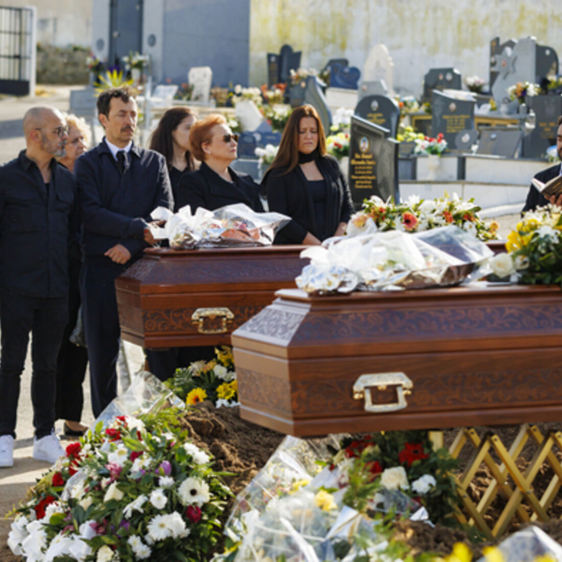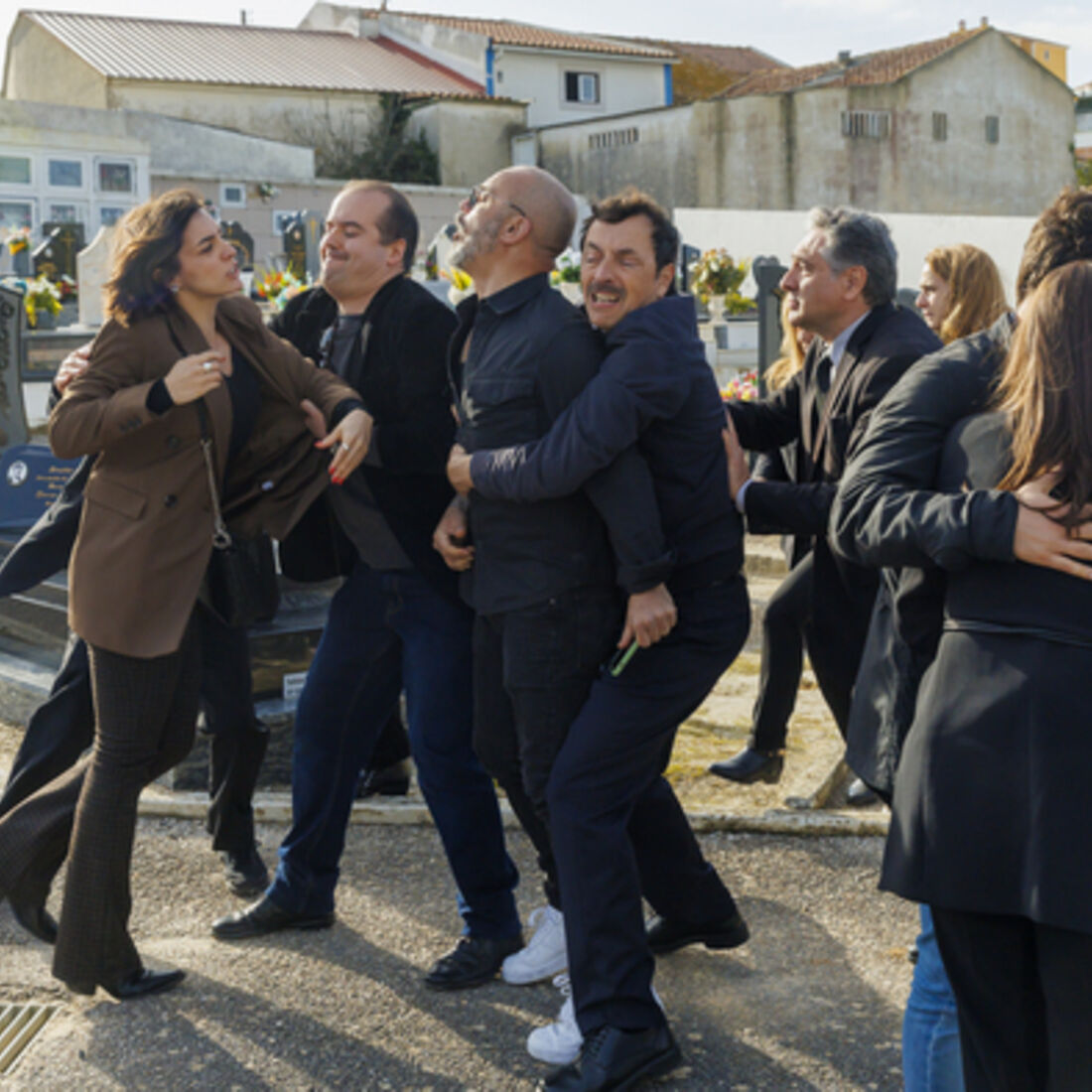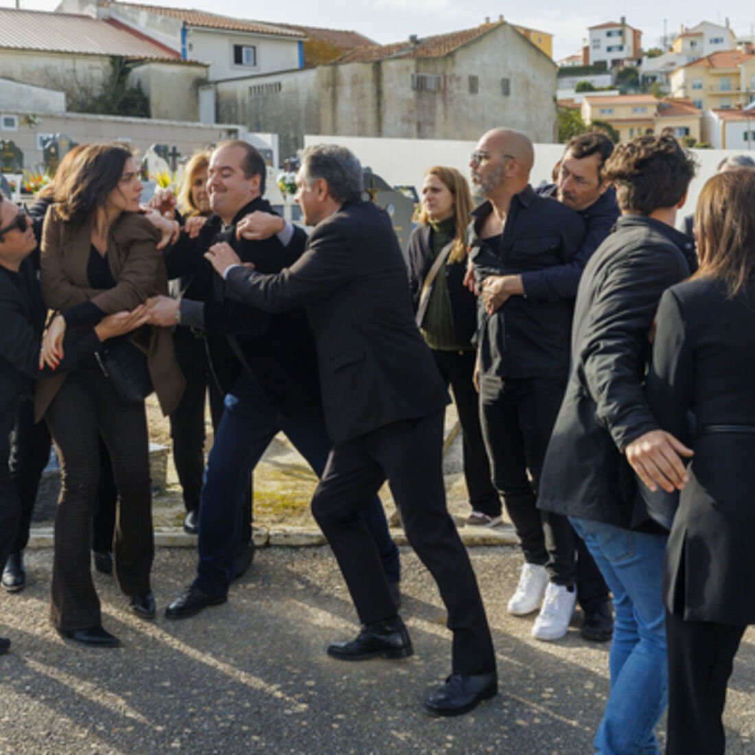 Novelas A Herança. Escândalo no cemitério: Beatriz é atingida com uma pedra e Sofia vira-se contra os familiares dos funcionários da fábrica