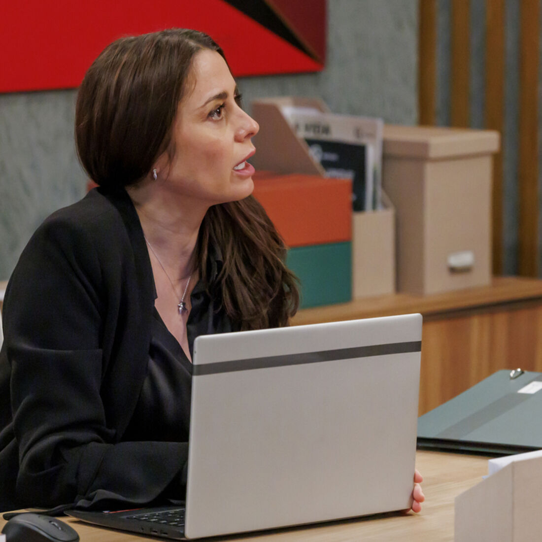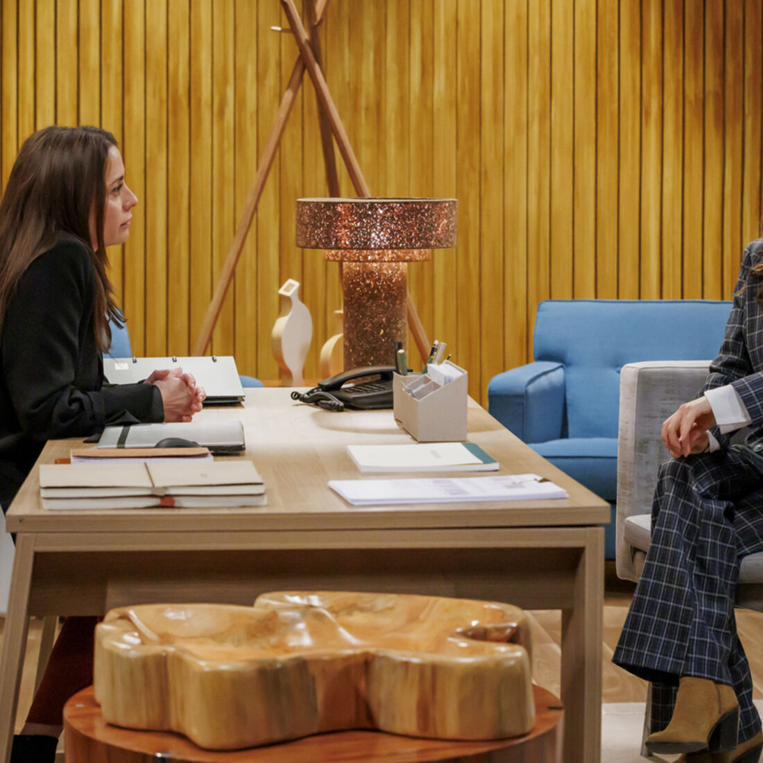 No gabinete, a mecânica lê noticias sobre tráfico de mulheres no computador. Vicente e Pilar chegam para a reunião e a mãe de Beatriz (Bárbara Branco) anuncia que o bandido está despedido e que não poderá voltar à fábrica, apanhando-o desprevenido.