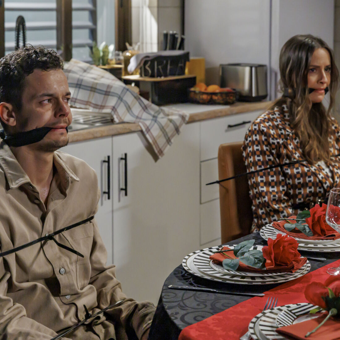Instantes depois, em casa de Pedro, já estão todos sentados à mesa, quando Amanda chega com Sofia e Pilar, também elas amarradas com as mãos atrás das costas e amordaçadas. “Bem-vindas a minha casa, senhoras. Finalmente a mesa está completa! Vamos passar o próximo passo”, anuncia, preparando-se para os torturar.