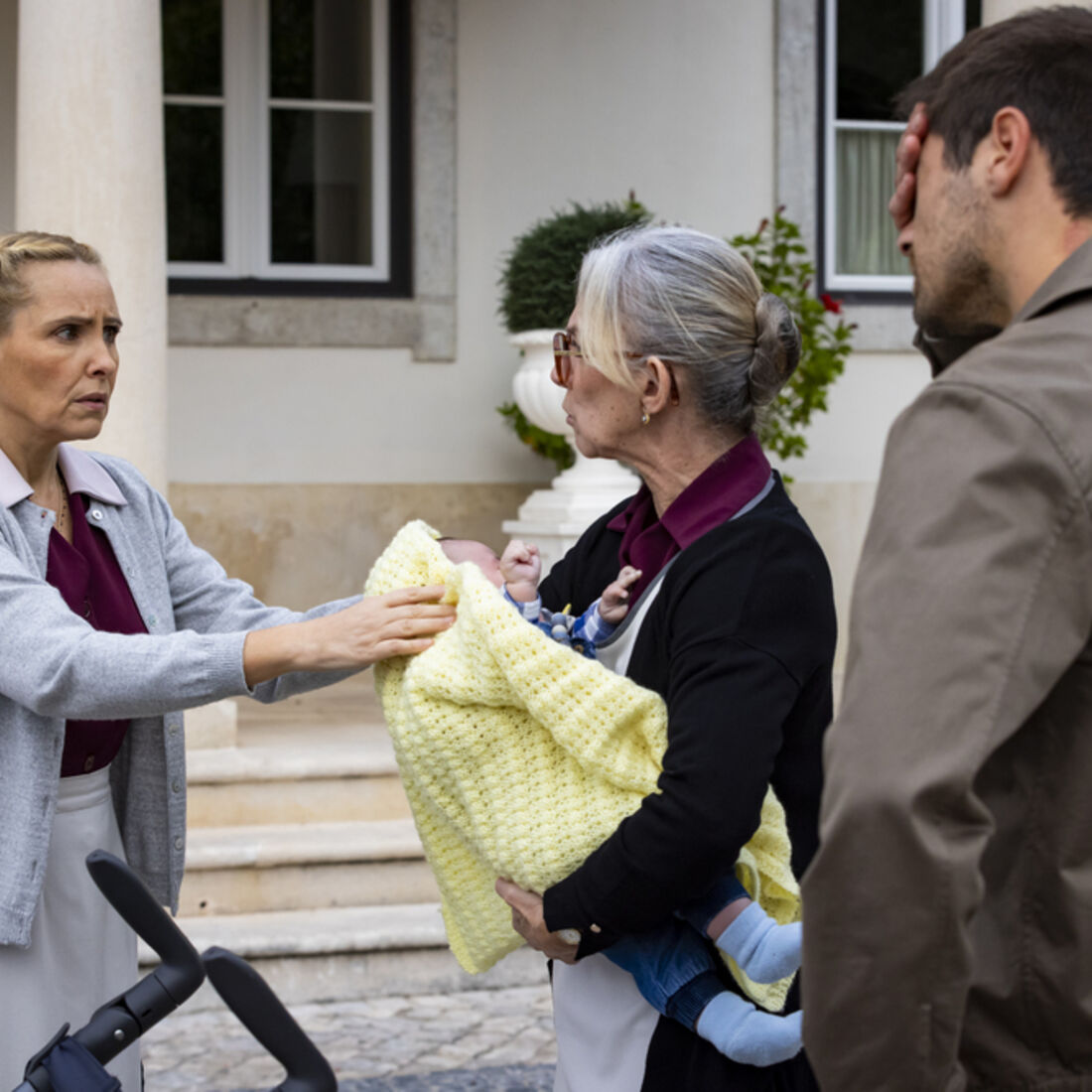 No jardim, Tomás (Lourenço Ortigão) empurra o carrinho com as mãos e tenta segurar o telemóvel entre a cabeça e o ombro, enquanto espera que lhe atendam a chamada. Diogo não para de chorar e deixa o pai apreensivo.