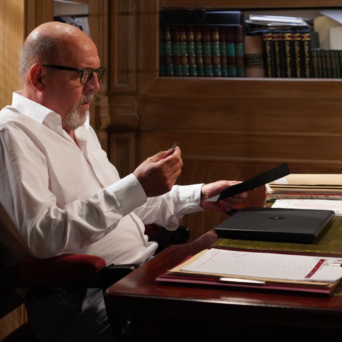 Horas depois, o empresário entra no local e encontra o envelope que a bandida deixou. Ao abri-lo, encontra uma pen e insere-a no computador. Curioso, ajeita-se na cadeira para ver o conteúdo da mesma.