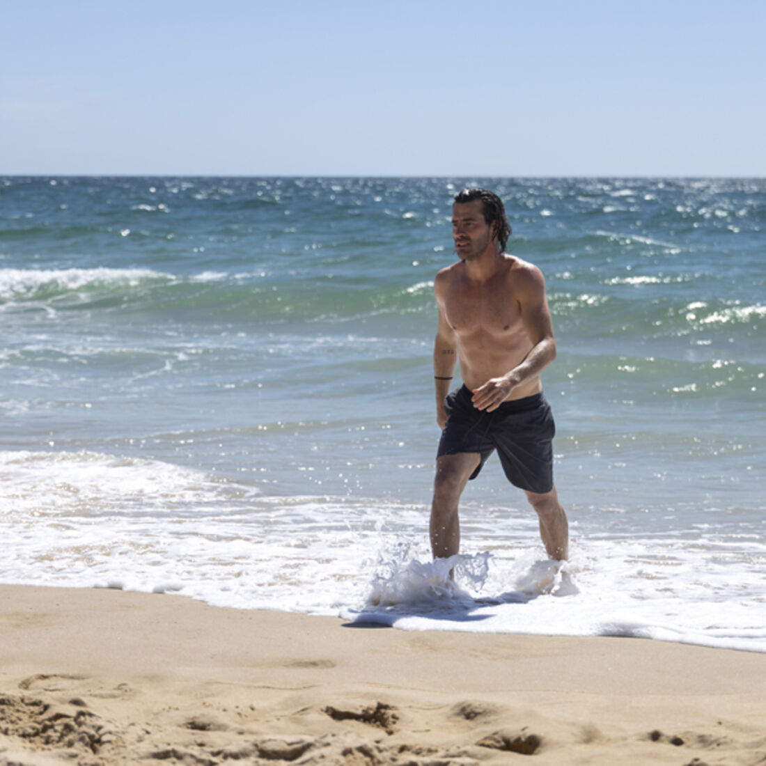 Um surfista corta as ondas com destreza. No areal, alguns banhistas observam-no e sorriem para ele, quando JD sai da água.