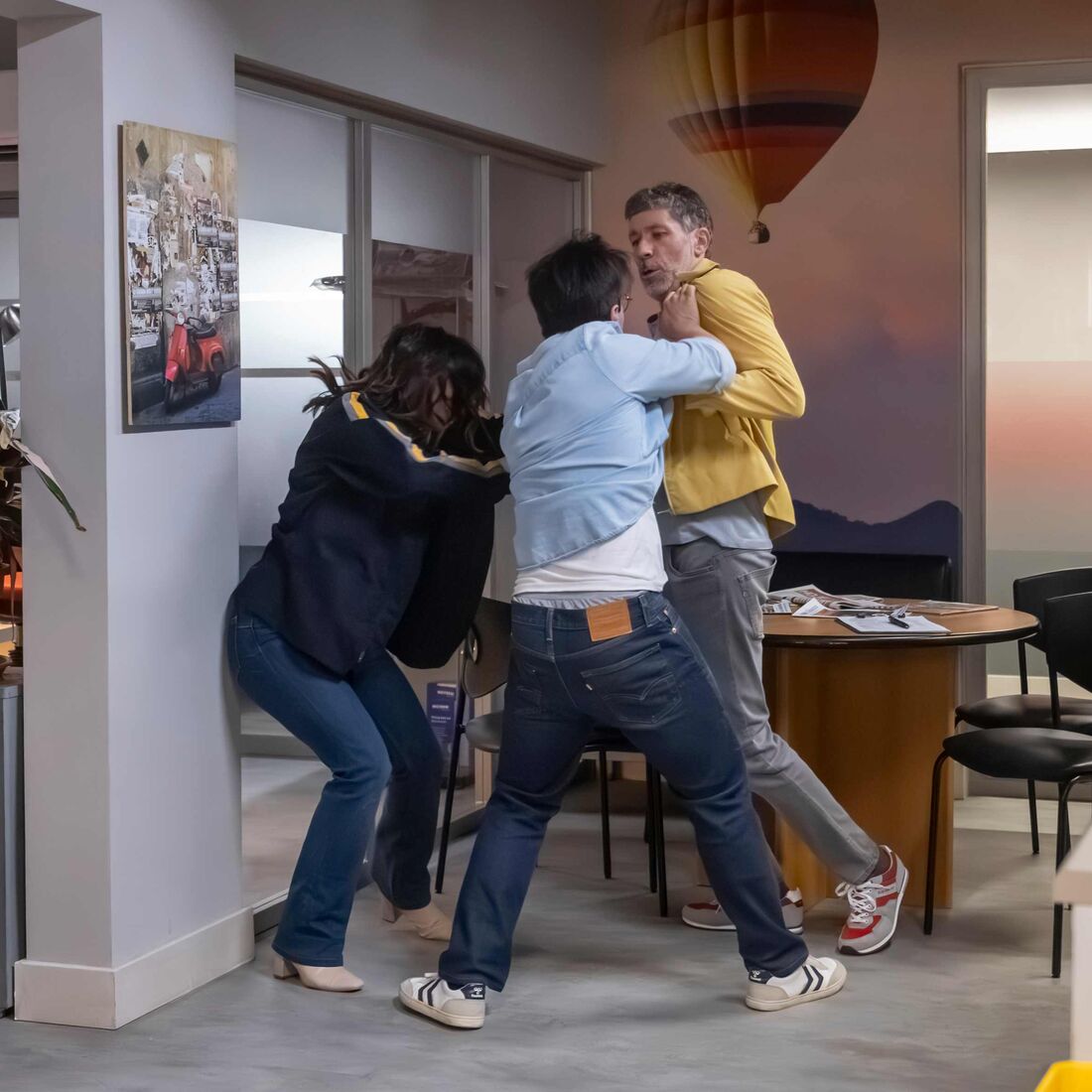 No local, o cliente dá pontapés a André (Lucas Dutra), que continua caído no chão. Melanie grita e tenta afastar o cliente do rapaz, quando Cris chega e fica em pânico ao ver o irmão no chão. De imediato, o rapaz atira-se ao cliente e consegue pô-lo em mau estado. Melanie cuida de André e pergunta-lhe se está bem. O pai de Nico acaba por ser levado para a esquadra. Bruno tenta acalmar Melanie e tem pena de André, por nunca conseguir cumprir os seus planos de engate.