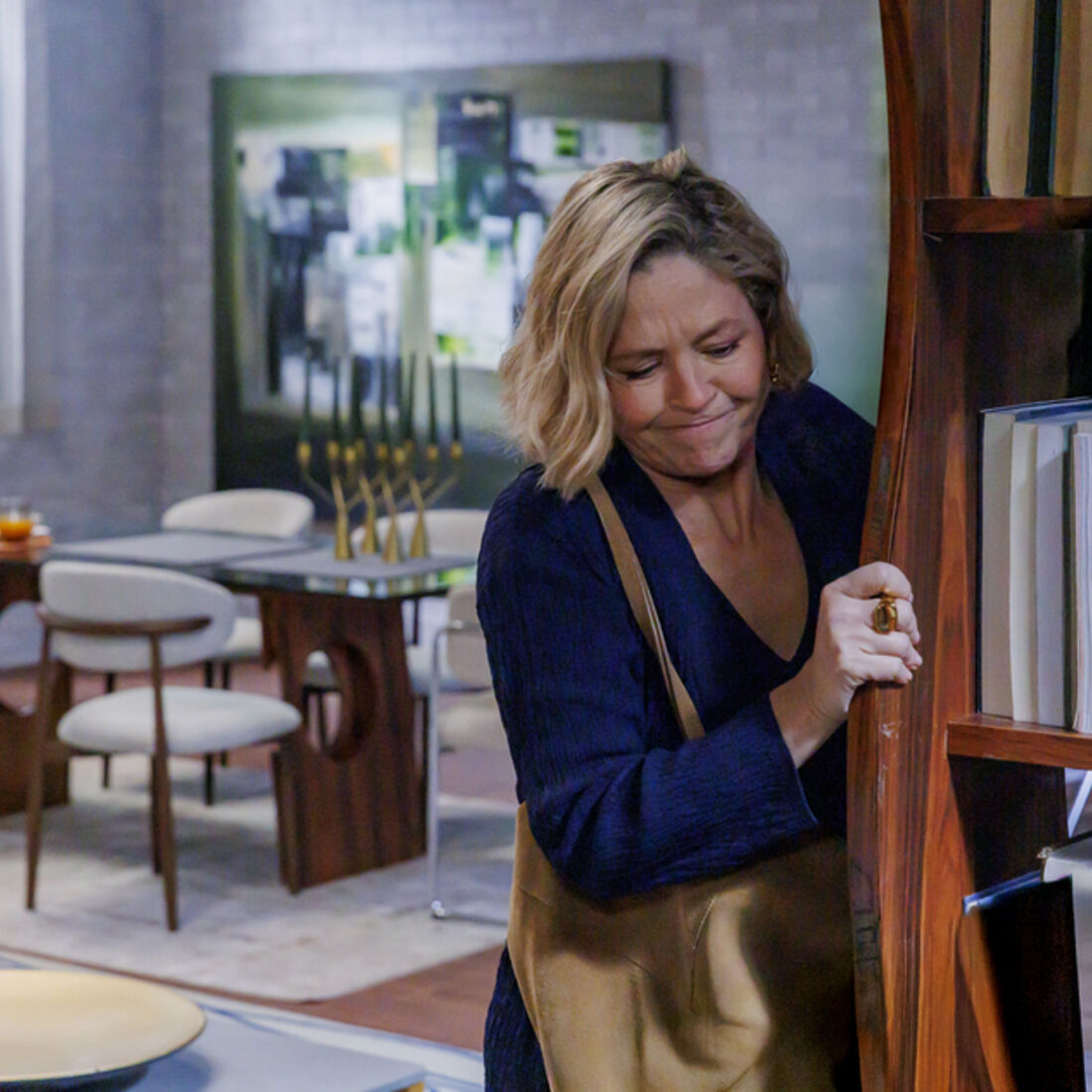O homem desmaia direto no chão, e Verónica aproveita para fazer com que uma estante de livros tombe sobre o corpo, guardando a estatueta na mala e saindo de casa.