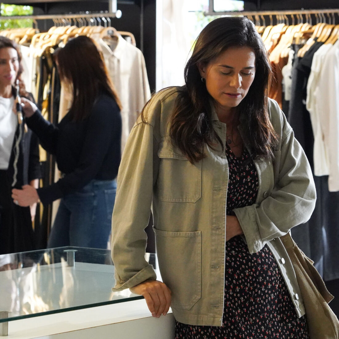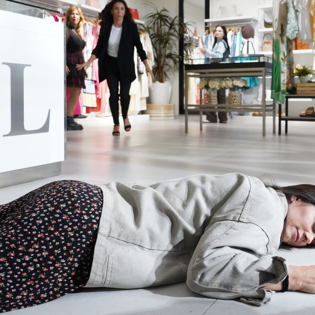 Entretanto, a costureira levanta-se, a custo. Limpa o sangue do braço e tenta respirar, ainda que tenha alguma dificuldade. Ao chegar à loja, finge estar bem. A gerente pergunta-lhe o que se passou e Vitória diz que caiu das escadas. Natália atende uma cliente quando a funcionária cai, desmaiada. Em choque, liga para a emergência médica.